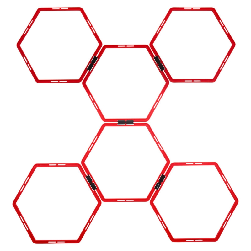 Pure2Improve Hexagon Agility Grid, Rood Het agility grid helpt conditie, coördinatie en snelheid te verbeteren. Door de ringen in afwisselende patronen te leggen zijn vele variaties mogelijk. Duurzame bindingsclips maken eindeloze lay-outconfiguraties mogelijk die de definitieve test van behendigheid, kracht, coördinatie en snelheid zullen bieden. Set van 6 stuks. Verpakt in een gekleurd etui.