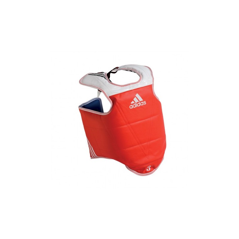 Protection réversible pour l’entraînement et la compétition. Intègre une protection des épaules. Serrage par lacet à l’arrière du plastron. Composition : PU. Coloris : rouge/blanc – bleu/blanc. Tailles : S - M - L - XL.